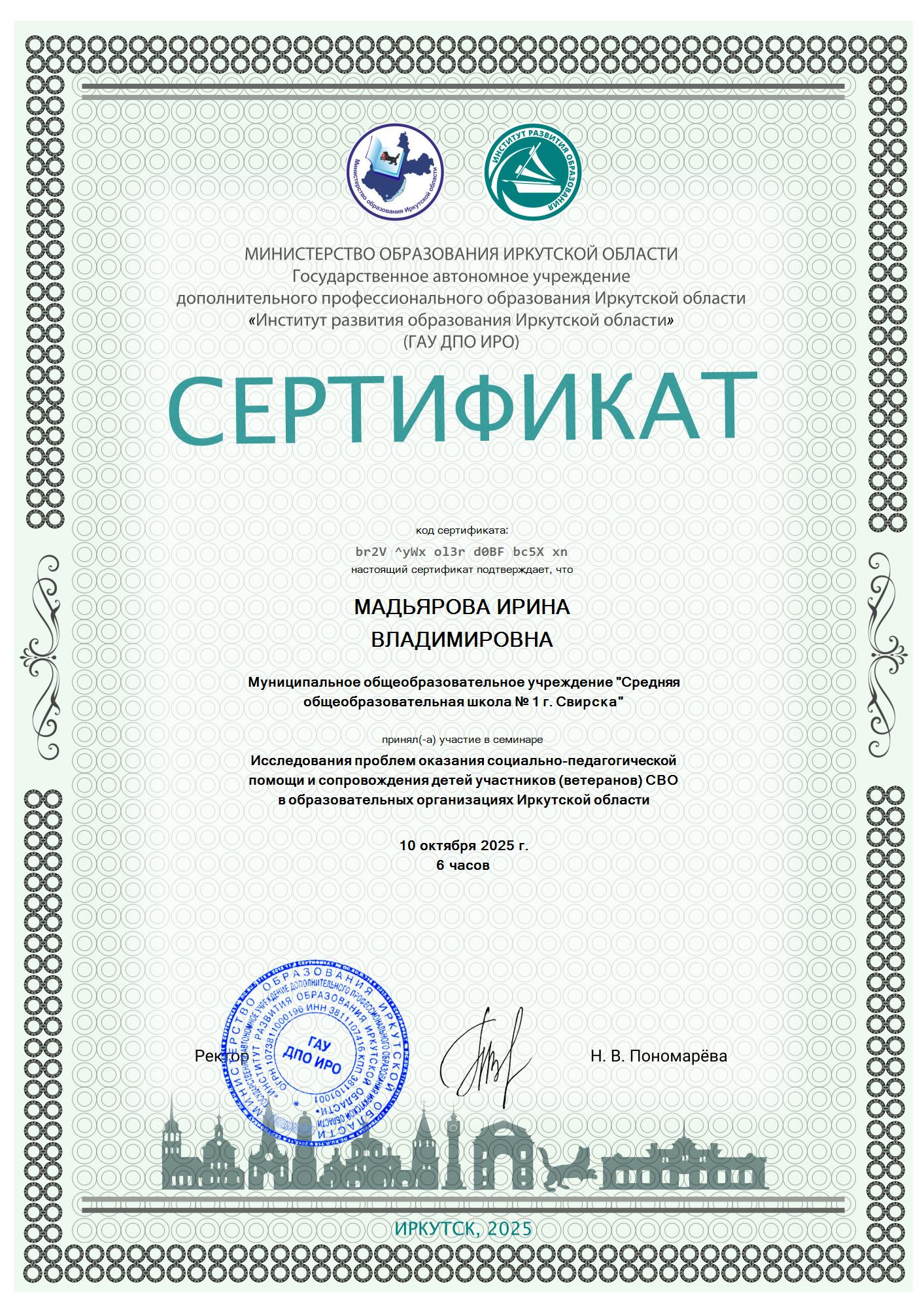 Семинар "Исследование проблем оказания социально-педагогической помощи и сопровождения детей участников (ветеранов) СВО в образовательных организациях.", в объёме 6 часов.